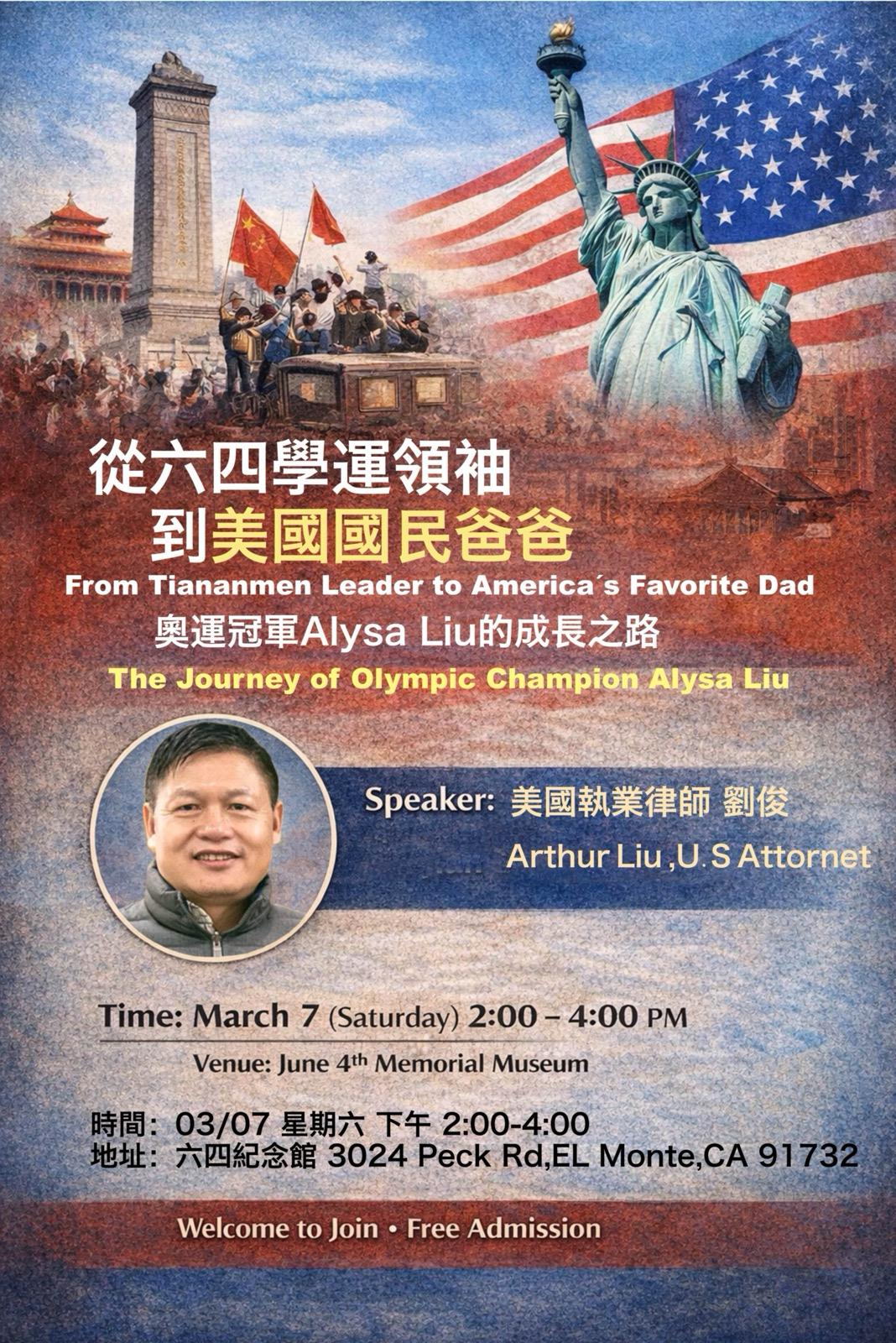 奥运冠军,“六四”二代Alysa已经成为新的美国偶像,她的父亲,我们的老战友刘俊律师培养女儿成才,拒绝中共金钱诱惑的故事,也成了海外华人圈的热门话题。相信很多朋友都希望有机会当面听这位“国民老爸”讲述培养女儿成为体育明星的故事。