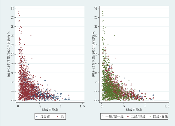 地方存量专项债与财政收入的比值Vs. 财政自给率(区县,2018-2022)