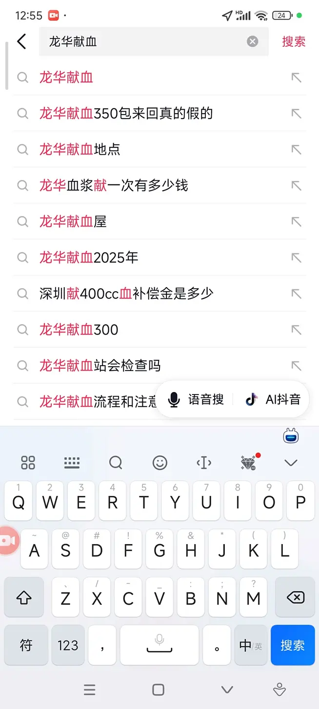 我每天在睡觉前、起床后,搜索那些在龙华汽车站周边搞直播的人,可并没有找到有用的线索;我还在抖音上搜索龙华汽车站卖血,可连搜了几天,也没找到一条与卖血有关的短视频。我突然想到王金的话:不是卖血,是献血。我就在抖音上搜:龙华献血。刚输入这几个字,搜索框里自动跳出来很多热搜。排行第二的是: