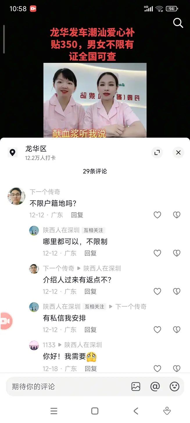 我立刻点进去查看,竟然看到了几个在抖音发布招献血日结工的中介。有些中介的定位地点正是龙华汽车站,也就是我反复向警察提到有非法组织卖血者,而警察则一再否认的地方。真实情况远比我以为的更严重,深圳龙华区简直成了个血源地。几乎每天都有大巴车从龙华区出发,带着满车的民工,去揭阳、揭西、潮汕等地献血或献血浆。