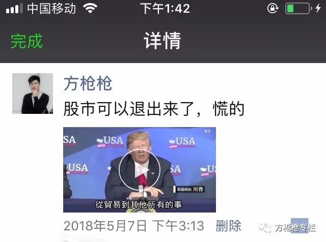 两个半月前,当川普确定要征税500亿的时候,我发了个朋友圈,建议大家从股市里撤出,被很多朋友讥笑,忧伤。